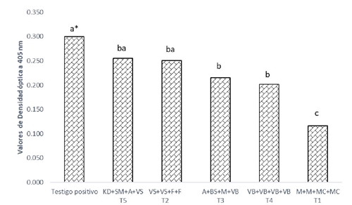 En el análisis de varianza se obtuvieron diferencias significativas entre los tratamientos en la concentración viral de TMV, el agrupamiento de medias de Tukey mostró para el tratamiento 1 con la secuencia de Messenger gold® (ia. proteína harpin aß) + Messenger gold® + MC Cream® + MC Cream® la concentración más baja de TMV (0.11 unidades de DO) la cual fue estadísticamente diferente de los demás tratamientos 5, 2, 3, 4 y testigo positivo (Figura 1). Chuang et al., 2014 mencionaron a la proteína harpin en la mejora de la resistencia a las enfermedades de las plantas.