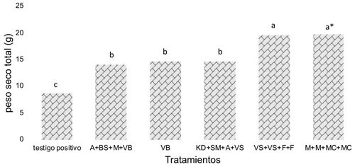Para la variable peso seco de hoja se obtuvieron diferencias significativas, el mayor peso (7.33 g) se registró con la aspersión de inductores de resistencia, T1 (Messenger gold® + Messenger gold® + MC Cream® + MC Cream®); no obstante, fue estadísticamente no diferente al T2 (Virus Stop® + Virus Stop® + fosfito de potasio + fosfito de potasio) y diferente estadísticamente a los tratamientos 3, 4, 5 y testigo positivo donde ocurrió el menor peso (Cuadro 2).