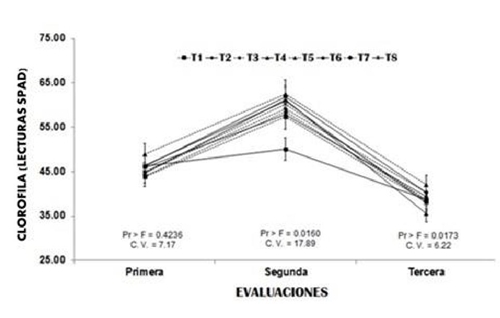 En la Figura 1, se observa que a partir de la segunda y tercera evaluación los tratamientos no presentaron el mismo efecto sobre la variable respuesta (Pr> F< 0.05), existió una diferencia notable en las unidades SPAD de T1 y los demás tratamientos; ya que estos presentaron un incremento exponencial de las unidades SPAD, mientras que los valores de T1 se mantuvieron constantes con respecto a la primera evaluación.