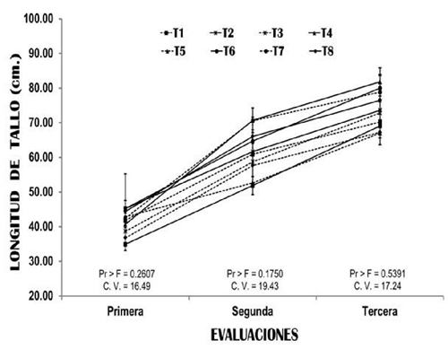 Figura 2 Longitud de tallos durante las tres evaluaciones a los tres días posteriores a los tratamientos en invernadero. Los tratamientos (T) de manejo precosecha fueron: T1= MgSO4 0.5 g L-1; T2= MgSO4 1 g L-1; T3= MgSO4 2 g L-1; T4= Ca(NO3)2 1 g L-1; T5= Ca(NO3)2 2 g L-1; T6= Ca(NO3)2 4 g L-1; T7= FeEDTA 5 mg L-1; T8= FeEDTA 10 mg L-1.