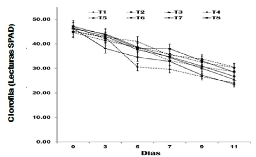 A partir del tercer día, las unidades SPAD de T7 decrecieron notablemente, mientras que en T1 disminuyeron a partir del quinto día, siendo estos dos tratamientos los que presentaron la menor cantidad de unidades SPAD al final del experimento. En los demás tratamientos los valores SPAD se mantuvieron constantes hasta el día 11 (Figura 5). El T8 presentó el mismo efecto en cuanto a la degradación de clorofila entre los días 3 y 7, mientras que el resto de los tratamientos evaluados presentaron diferencias significativas en ambos días de evaluación. Hasta el día siete, el T8 preservó mejor este pigmento.