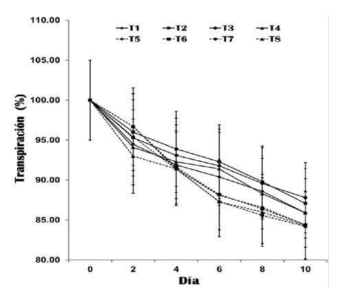 El tratamiento que mostró el menor porcentaje de transpiración fue T3 con una tasa de 12.2% (Figura 7, concuerda con Torre et al. (1999)) en donde menciona que frecuentemente es observado que los órganos de las plantas que presentan baja transpiración manifiestan desordenes debido a deficiencia de calcio. Se reporta que las rosas de corte, así como los frutos y tubérculos, se encuentran dentro de esta categoría. El calcio en dichos órganos es conducido dentro de la planta generalmente por el xilema (Marschner, 1995) y por lo tanto, la baja transpiración podría resultar en menor cantidad del elemento transportado hacia esos órganos.