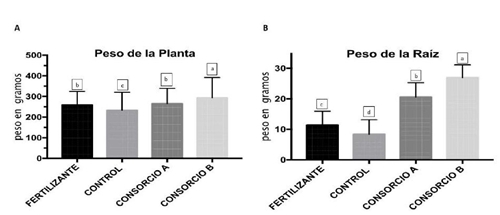 Al final del ciclo productivo (tres meses) se obtuvieron plantas sanas y con mayor peso para ambos consorcios, que el fertilizante y control, solo el consorcio B promovió el crecimiento total de la planta y peso de la raíz a diferencia de los demás tratamientos, se realizó un Anova y comparación de medias mediante la prueba de Tukey (a= 0.05); (Figura 1, 2A y 2B).