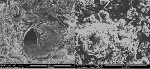 Figura 10 Imagen de microscopio electrónico de barrido en un nódulo de EP. A la izquierda, la imagen completa, a la derecha, un acercamiento a la zona donde se identificó el bacteroide.