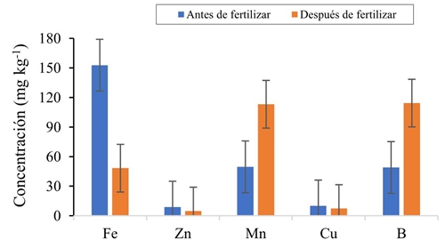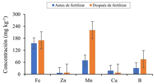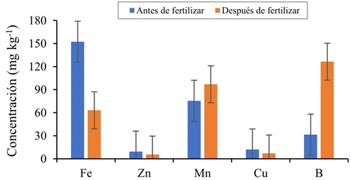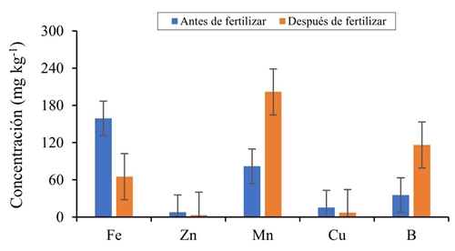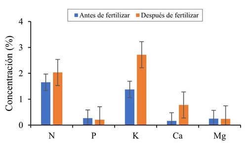 El primer análisis foliar (Cuadro 1) se realizó durante el mes de julio y mostró deficiencias en N, K, Ca, Mg y Zn, de acuerdo con los intervalos propuestos por Osorio (2012). Por su parte, el P, B, Mo y Mn se ubican en el intervalo de suficiencia, pero el Fe y Cu excedieron las concentraciones recomendadas, lo cual es normal en suelos con pH ácido, donde las concentraciones de Al, Fe, S y Mn en hojas suelen ser elevadas (Bernal-Forero y Almanza-Merchan, 2016).