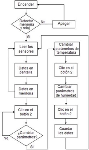 Para tener control del sistema, una placa del circuito de control fue diseñado e implementado mediante el software Proteus (Versión 8.9, Inglaterra). Además, fueron instalados de sensores en la cabina de secado, en la chimenea y en el colector solar. Se realizaron mediciones del sistema de funcionamiento del secador solar, para ello un algoritmo fue creado con el objetivo de registrar en tiempo real la temperatura y humedad en el display. El diagrama de flujo de las etapas consideradas en el sistema para controlar/manipular la temperatura y humedad es mostrado en la Figura 2.