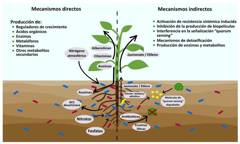 Among the microorganisms that inhabit the rhizosphere, those with the ability to promote crop development and yield are distinguished; through direct and indirect mechanisms (Figure 1), which are called plant growth promoting microorganisms (MPCV). The direct mechanisms improve the nutritional status of the plant by increasing the volume of exploration and functionality of the roots, the uptake of water, the availability and absorption of nutrients and the physiology of the entire plant (Kumar et al., 2015). This is carried out through the production of growth regulators, organic acids, enzymes, metalophores, vitamins and other secondary metabolites that directly impact plant growth (Grageda-Cabrera et al., 2012; Moreno-Reséndez et al., 2018).