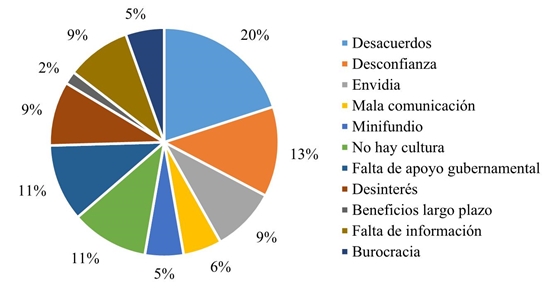 In order to know the idiosyncrasy of the average corn producer in the study municipality, it is necessary in the first instance to try to understand the reasoning of the producer, its origins and its repercussions on their daily work. The field results showed that 81% of the producers do not belong to any peasant organization and the causes of this are shown in Figure 2. The rest of the producers who do belong to a peasant organization point out that the main benefits that this membership brings them are the stockpiling, credit and support for the purchase of machinery and supplies.