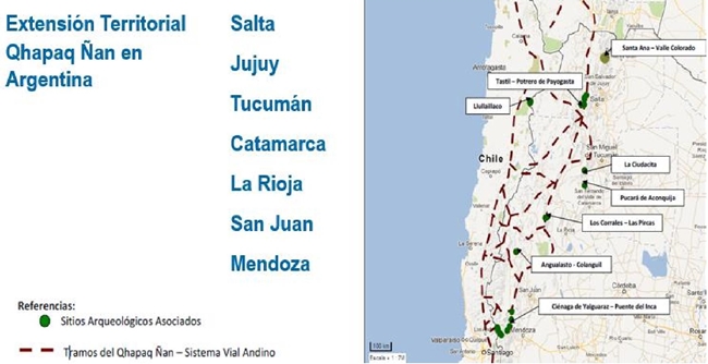 Se denomina Qhapaq - Ñan, Camino Principal Andino, al sistema vial andino heredado del imperio incaico que involucró centros poblados, almacenes, puestos de control, entre otros, constituyendo la obra tecnológica más importante de la América prehispánica. El camino recorre seis países: Argentina, Bolivia, Chile, Colombia, Ecuador y Perú y siete provincias argentinas (Jujuy, Salta, Catamarca, Tucumán, La Rioja, San Juan y Mendoza) como se muestra en la Figura 1.