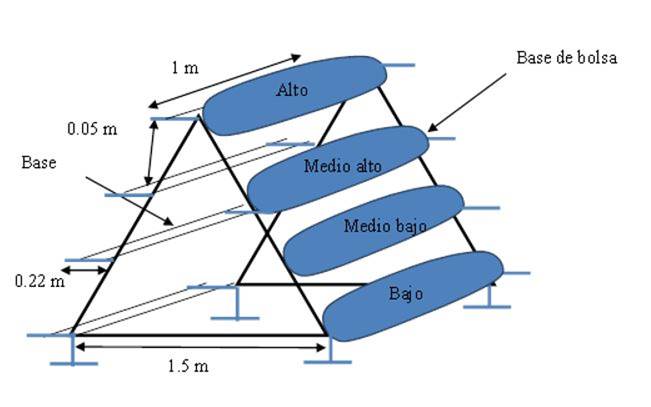 The pyramidal system was manufactured with a steel structure, with three metal tubes 1.5 m long each, the triangles have eight short tubes of 0.22 m, welded to the sides at four heights every 0.5 m, which are used to place two sections of 1 m long tube, which function as a base to place the bags (Figure 1). Each repetition was made up of three modules. The horizontal bags with coconut fiber are Germinaza® with the mixture of 50% powder and 50% fiber, 1 m long by 0.2 m wide with a volume of 18 L. 24 horizontal bags were used per repetition.