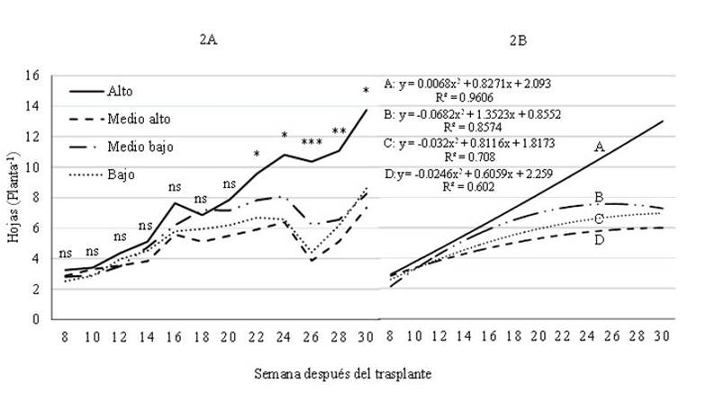 Figure 2 Number of leaves per greenhouse strawberry plant produced in four different strata in a production system with a pyramidal structure. 2A) the curves connect the means, data evaluated by analysis of variance (General Linear Model, SAS); 2B) curves calculated by linear regression. ns, *, **, *** not significant and significant at p< 0.05, 0.01 and 0.001, respectively.