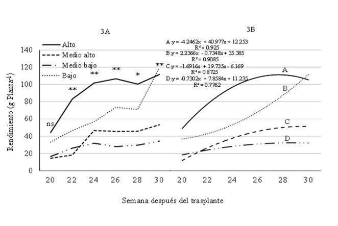 The yield was higher in the upper stratum of the pyramid, except in week 30 where the plant yield was similar to the low stratum (Figure 3A). The plants of the low stratum had an upward trend in yield, while the curve of the high stratum had a decreasing behavior at the end of the experiment (Figure 3B). According to Ledesma et al. (2008), the temperature and the length of the day play a fundamental role that affects the production of fruits. Ledesma and Kawabata (2016) mention that there is a decrease in fruit size and weight caused by high temperatures (greater than 32 °C for more than 4 h) in strawberry cultivars, temperatures less than 2 °C and greater than 35 °C for prolonged periods, cause devitalization of pollen, floral abortion and fruit malformations.