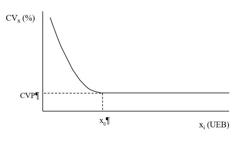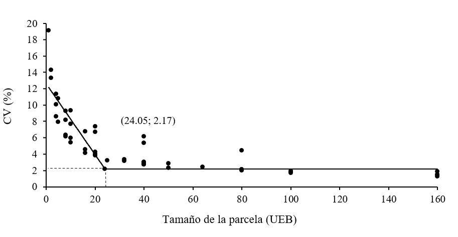 donde: CVx es el coeficiente de variación entre los totales para parcelas con x i unidades básicas; CVP es el coeficiente de variación en el punto donde se unen los dos segmentos; x es el tamaño de parcela medido en unidades básicas; y εi es el error asociado a CVx, supuestamente normal e independientemente distribuido, con media cero y varianza constante.