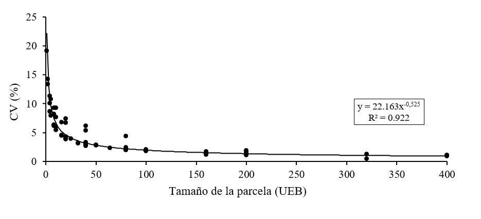 Figura 4. Relación entre el coeficiente de variación (CV) de la producción con el tamaño de la parcela medido en UEB.