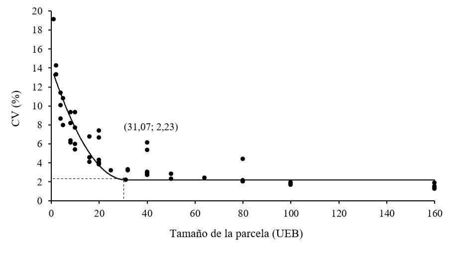 En este caso, el tamaño óptimo fue de 31.07 UEB, equivalente a parcelas de 93.22 m2 (Figura 6).