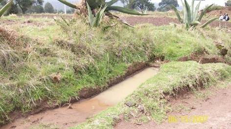El terraceado es una práctica muy frecuente, siguiendo con el ejemplo anterior (Ruvalcaba, 1983) explica como el mismo productor aprovechó los bordos construidos a base de maguey para retener el agua de lluvia, para ello el productor desvió las corrientes de agua en las partes altas para que esta fluyera hacia sus terrenos y ahí la distribuía a lo largo de toda la superficie cultivable, esta práctica es conocida como ‘cosecha de agua’. Esta forma de manejo del agua es parte del sistema de producción de ‘arrope de humedad, que permite adelantar hasta en mes y medio la siembra para protegerse contra posibles heladas y granizadas tempranas, en la época de llenado de grano’. Figura 2.