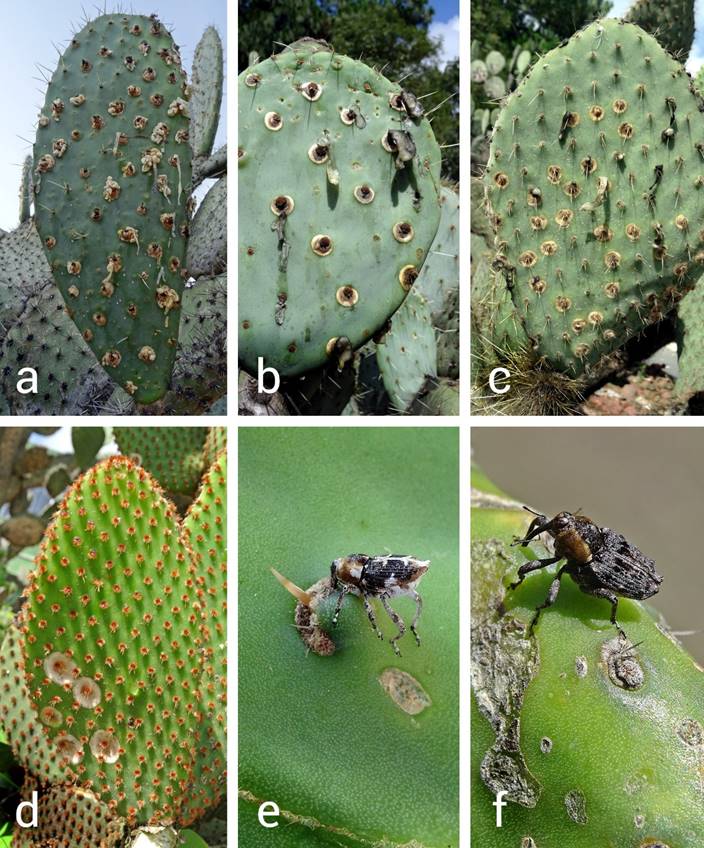 Figura 1 Observaciones de la interacción Cylindrocopturus spp., Opuntia spp. en el Estado de México. a) daño por Cylindrocopturus biradiatus en Opuntia ficus-indica; b) cladodio de O. robusta afectado por C. biradiatus; c) daño por C. biradiatus en O. huajuapensis; d) Opuntia microdasys afectado por C. biradiatus; e) Cylindrocopturs biradiarus; y f) Cylindrocopturus ganglbaueri.