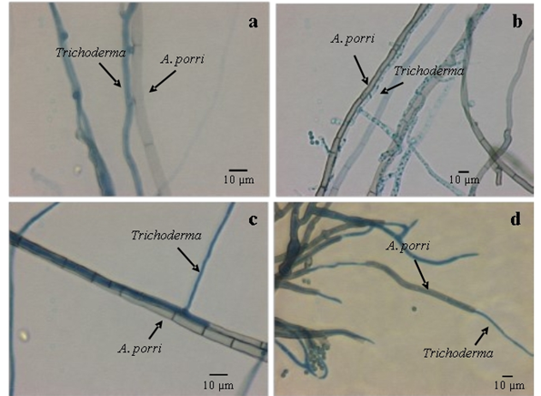 En forma similar, diversos estudios muestran que Trichoderma tiene actividad antagónica contra A. porri y que hay diferencia entre especies e inclusive entre la misma especie de Trichoderma. Prakasam y Sharma (2012) muestran que los aislados de T. viride y T. harzianum obtenidos de cultivos de plantas inhiben el crecimiento radial de A. porri de 18.9 a 55.7% y de 19.7 a 61.5%, respectivamente.