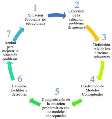 Research through SSM incorporates different models to intervene in the real world, allows to choose new solutions from different points of view, choosing consensually one when the conflicts of the problem situation are best resolved, this cyclic repetition drives change and adaptation (Cezarino et al., 2016). Figure 1 shows the description of the stages of the SSM evaluation.