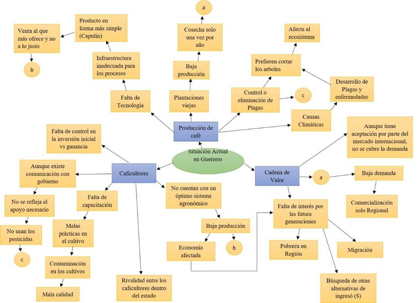 In process 1 ‘Unstructured problem situation’, it was identified that the main problem of coffee in the State of Guerrero is the drastic drop in production in 2019, identifying climate variability, international price volatility, control of pests and diseases, increased violence, migration and marginalization as momentous causes; these causes recognize that they have affected the production chain, from input processes, production, transformation, marketing, until reaching the final consumer.