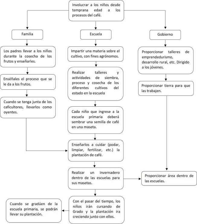 Finally, the conceptual model generated by producers due to the lack of interest of future generations for the cultivation of coffee (Figure 3). Part of the solutions proposed by the actors are to involve children in the coffee process, supported from the family, education and programs from the authorities of the different levels, that include the award of scholarships, workshops, practical activities, among others, carried out inside and outside the school (Flores-López et al., 2018).