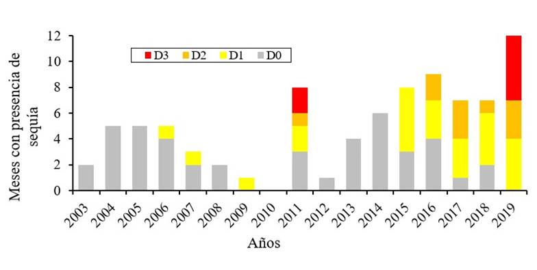 En el área de estudio, el periodo de sequía pasó de ocurrir en un par de meses a casi todo el año tal como sucedió en 2019. Al respecto CNA-SM (2020) indica que cuando esta sequía se presenta por más de seis meses al año, además de afectar la actividad agrícola y ganadera de la región, se impacta el sistema hidrológico y la ecología del lugar. Estas sequías han sido catalogadas por el CNA-MS (2020) como: D0 (anormalmente seco), D1 (sequía moderada), D2 (sequía severa), D3 (sequía extrema) y D4 (sequía excepcional). A continuación, se muestra la incidencia de la sequía y su intensidad en el área de estudio durante 16 años (Figuras 2, 3 y 4).