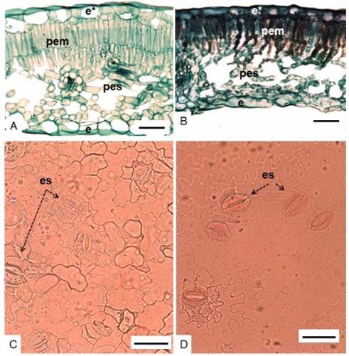 Figura 2 Anatomía de la hoja de rosa ‘Engagement’ (A, C) y ‘Freedom’ (B, D). Corte transversal (A, B); vista paradermal (C, D); e*= epidermis adaxial; e= epidermis abaxial; pem= parénquima en empalizada; pes= parénquima esponjoso; es= estomas; escala= 50 (m.