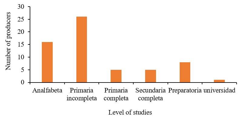 The producers engaged in coffee activities in the study region are people between 20 and 75 years old; of these, 26% are between 20 and 40 years old; 48.9% between 41 and 60 years old and 24.6% between 61 and 75 years old. In relation to gender, 60.7% are men and 39.3% women. Women who grow coffee do so because their husbands work outside the municipality or are widows. In addition, they take care of children and carry out other activities outside the home that help them to complement the economy of their families. As for marital status, 69% are married, 16% are in a consensual union, 3% are single and 11% are widowed.