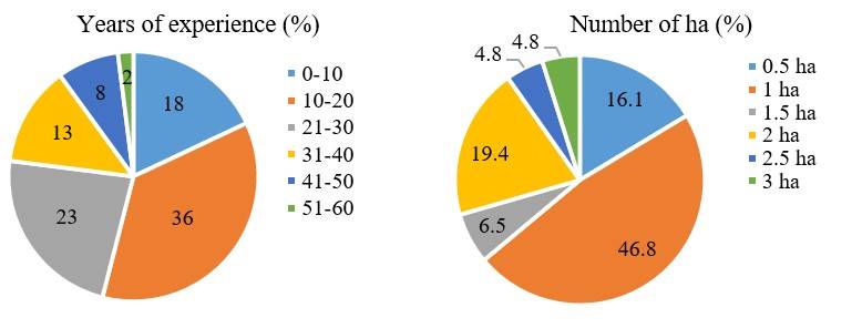 Figure 2 Stratification of experience in years (%) and number of hectares (%) in coffee production in Pantepec, Chiapas.
