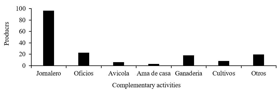 According to Medina-Meléndez et al. (2016), the density of coffee plants in the state of Chiapas ranges from 3 334 plants ha-1 to 4 444 plants ha-1. Coffee producers from the study region diversify their activities within and outside agriculture, which allows them to obtain additional income in order to meet the needs of the family. Quiroz (2006) mentions that the diversification of activities allows producers to reduce market and production risks, as well as maximize land use and remain in production activities throughout the year. This increases their gross sales, reduces their fixed costs per individual crop and provides continuous employment.