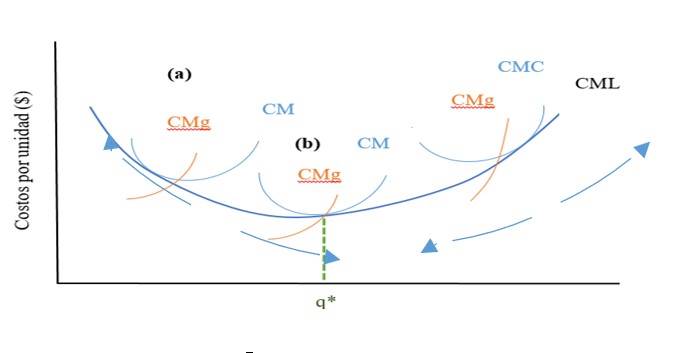 La eficiencia económica requiere tomar ventaja de las económicas de escala (si existen) para impulsar hacia abajo los costos (Case et al., 2012), un pequeño productor con frecuencia no puede tomar ventaja de las economías de escala derivado de los pequeños volúmenes requeridos, tiene que tomar los precios en el mercado al menudeo, pagando un sobre precio del insumo o servicio o bien subutiliza la infraestructura al adaptarse a los estándares más cercanos a la escala productiva (Figura 2a), cuando debería estar en la escala optima única de la planta que es donde se minimiza el costo promedio total (al no existir un mayor medio para bajar los costos) y es ahí donde se encuentra la eficiencia económica (Figura 2b).