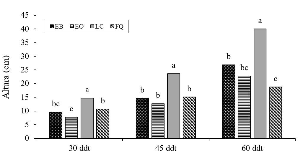 Se encontraron diferencias (p≤ 0.05) en la altura de planta entre los tratamientos a los 30, 45 y 60 ddt (Figura 2). Las plantas cultivadas con LC presentaron el mayor crecimiento en las tres fechas evaluadas con 14.75, 23.767 y 40 cm respectivamente, y superó al testigo (FQ) en 34.1, 57.8 y 116.2%, quien presentó una altura de 11, 15 y 18.5 cm, respectivamente.