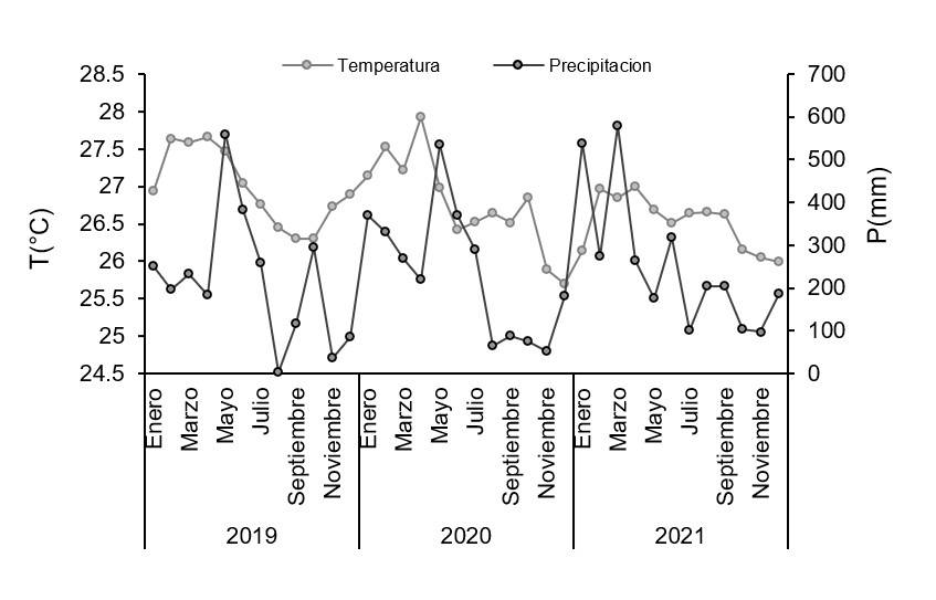 Se realizaron labores culturales de manejo de la parcela, podas de formación (especialmente el primer año) y podas fitosanitarias, control de arvenses con guadaña cada tres meses y plateo previo a la fertilización según análisis de suelo (Toala et al., 2019). El suelo se caracterizó por presentar textura franco-arcillosa, pH de 5.89 y contenido de materia orgánica de 1.99 g 100 g-1.