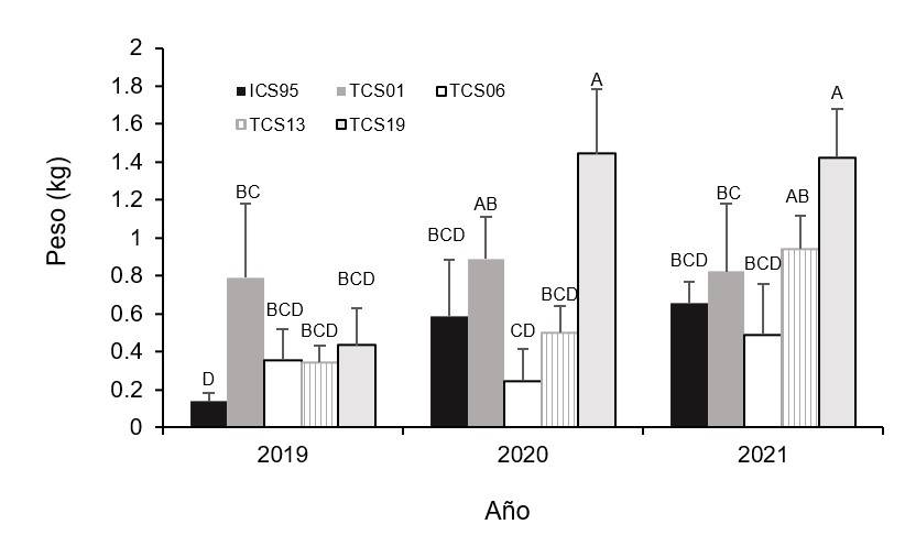 En el segundo año, los genotipos TCS 01 (0.887 kg) y TCS 19 (1.44 kg) presentaron mayores valores promedio con respecto al resto de materiales evaluados y en el tercer año, este último genotipo nuevamente fue superior con una producción promedio de 1.44 kg árbol-1 (Figura 3).