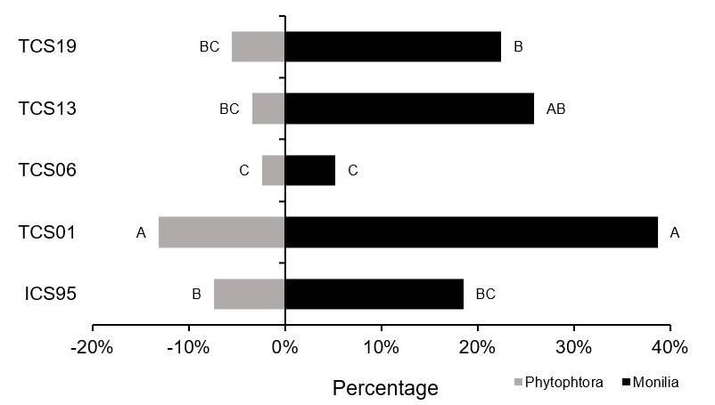 El TCS 13 fue el segundo material con mayor grado de afectación por monilia (25.85%) y junto con TCS 19 presentaron un comportamiento similar con relación a Phytophthora sp. (3.41% y 5.48% respectivamente). Con relación al testigo comercial ICS 95, los resultados muestran que el grado de afectación por M. roreri y Phytophthora sp., fue similar a TCS 19 y TCS 13.