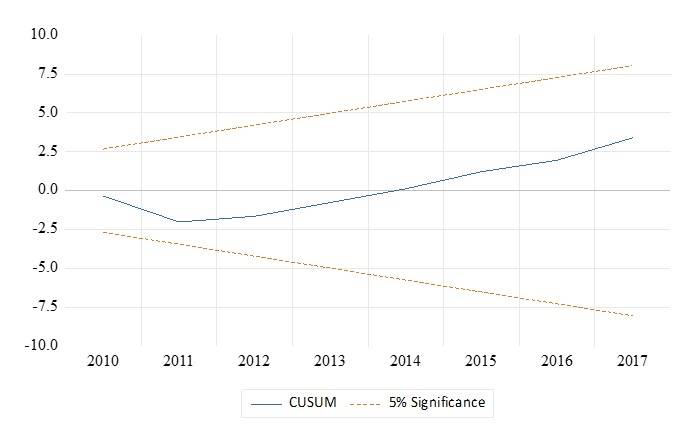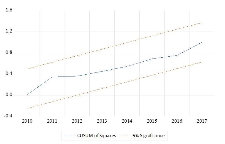 Con la prueba White aumentada (con términos cruzados) se probó el posible sesgo de especificación del modelo, la cual con un valor p de 0.53 confirmó la correcta especificación. Por su parte, se aplicó la prueba de error de especificación en regresión -RESET, por sus siglas en inglés-, de Ramsey, la cual con un valor p de 0.59 permitió desechar esa posibilidad. Se comprobó la estabilidad paramétrica con las pruebas Cusum y Cusum al cuadrado -of Scuares-, las cuales se pueden observar en las ocho Figuras 4 y 5, respectivamente.