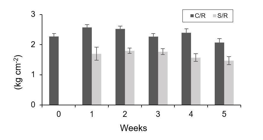 Firmness. It was evaluated with a GY-3 manual texture meter. The chilies were compressed in three different places with the compression tube until the skin of the fruit broke slightly. The results were expressed in kg cm-2.