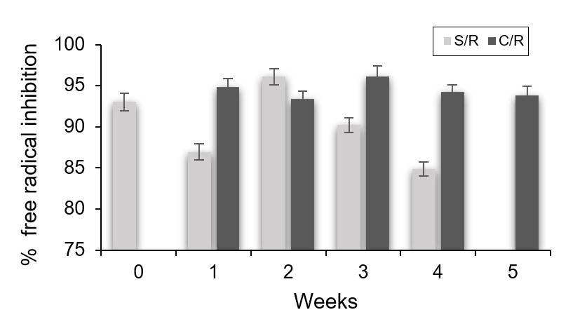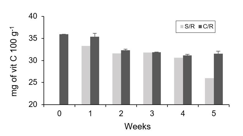 Vitamin C showed a tendency to decrease throughout storage and although the values found were slightly higher in the coated fruits, statistically there is no significant difference between them and the control batch (p≥ 0.05) during weeks 0, 2, 3 and 4; significant differences were observed at weeks 1 and 5, where the uncoated fruits of the latter showed a more pronounced reduction (Figure 2).