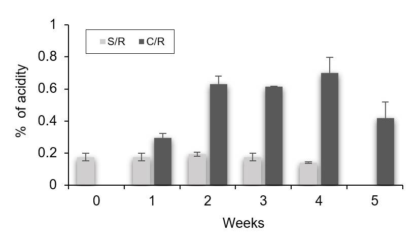 The acidity content of habanero chilies (Figure 1), was significantly different between W/C (coated) and U/C (uncoated) chilies during storage, where W/C chilies showed an increase in acidity content, this behavior is associated with the edible coating that acts as a modified atmosphere that slows down the metabolic process in the fruits, which results in an accumulation of organic acids that, together with temperature, delays the degradation of this acid, this causes the chilies to remain green and acidic (Figueroa et al., 2013). On the other hand, in control chilies, this variable tends to remain constant throughout storage, with a decreasing dynamic due to an increase in the volatilization of organic acids as there is no coating.