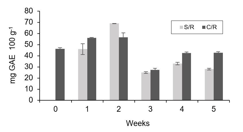 Polyphenols are one of the main metabolites found in habanero chilies, which contribute to the antioxidant effect of this type of fruit. The results obtained revealed that the polyphenol content in the control fruits and in the coated fruits showed a tendency to increase until the second week, and then decrease and increase again in the 4th and 5th week for W/C chilies (Figure 3).