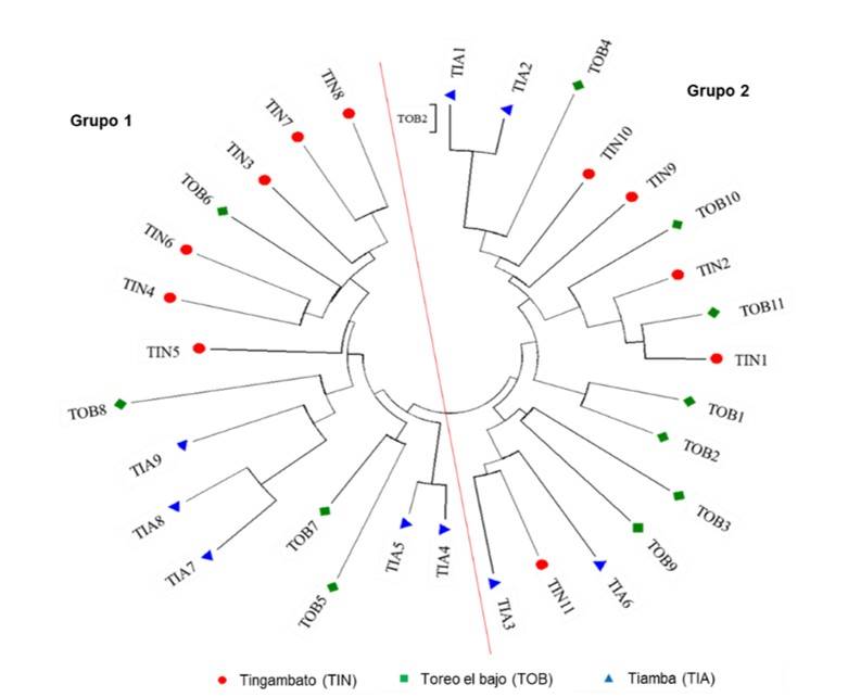 Figura 1 Árbol filogenético de 31 variedades cultivadas de Capsicum pubescens, procedentes de tres localidades de los municipios de Tingambato y Uruapan, Michoacán, México, con base en datos moleculares obtenidos a partir de dos combinaciones de iniciadores derivados del citocromo CYP450.