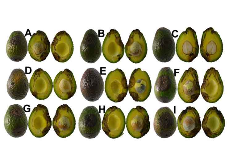 Se utilizaron los postulados de Koch para corroborar el agente aislado como causante de los síntomas observados. Las pruebas de patogenicidad se realizaron en frutos completamente sanos sin daños visibles, con un contenido de materia seca en pulpa entre 23-25% (NMX-FF-016-SCFI-2016, 2016). Se hicieron tres heridas (3 mm) en la zona longitudinal del fruto y se colocó suspensión de esporas (106 esporas ml-1) sobre las heridas. El experimento se repitió dos veces. Todos los frutos se incubaron a 27 °C y 90% de humedad relativa hasta que apareció la enfermedad de antracnosis. Se registró el desarrollo de antracnosis para cada aislamiento y se aisló nuevamente el patógeno para confirmar la identidad morfológica y las características culturales.
