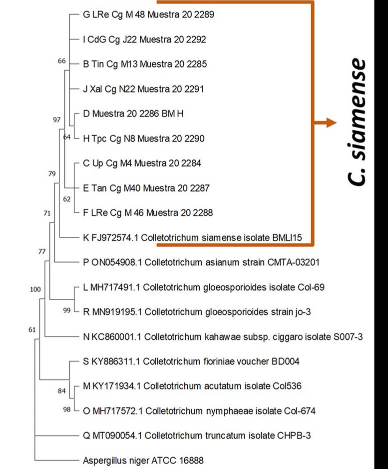 La identificación de C. siamense en la región del Pacífico Centro de México indicó que el hongo se ha dispersado dentro de las principales regiones productoras de aguacate en México. La investigación de Weir et al. (2012) mencionaron que C. siamense está representada por 30 aislamientos de una amplia gama de hospedantes de varias regiones tropicales y forma un clado monofilético que no puede subdividirse genéticamente sin ser considerado un complejo de especies de C. siamense. Las secuencias ITS no separan de manera confiable a C. siamense del resto de C. gloeosporioides sensu lato (C. alienum, C. fructicola y C. tropicale).