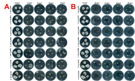 Figura 6 Crecimeinto de micelio in medio PDA después de 48 h expuestos a estrés de fungicidas. A) fludioxonil + azoxistrobin (10, 20, 50 y 70 ppm); y B) sulfato de cobre (20, 40, 60 y 80 ppm).