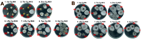 Figura 5 Inhibición del crecimiento micelial de C. siamense bajo estrés del fungicida. A) fludioxonil + azoxistrobin; y B) sulfato de cobre, después de 48 h de incubación a 27 ºC ±1 ºC.