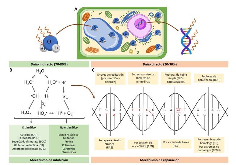 Figura 1 Daños ocasionados por la radiación gamma, principales mecanismos de reparación e inhibición de radicales libres. A) la radiación gamma tiene la capacidad de generar iones, haciéndola capaz de reaccionar directamente con el DNA o con moléculas de agua; B) el daño indirecto sobre el DNA y mecanismos de inhibición de radicales libres; y C) el daño directo sobre el DNA y mecanismos de reparación.