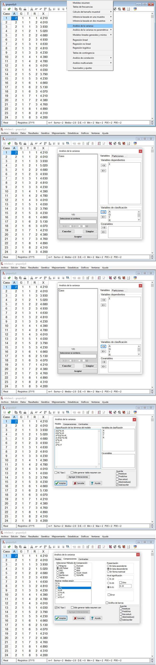 Con InfoGen se describe el procedimiento que permitirá la aplicación de la técnica de mínimos cuadrados para la obtención de los análisis de varianza, pero también podrían emplearse InfoStat (https://www.InfoStat.com.ar) o SAS (https://www.sas.com), entre otros. Los tres paquetes estadísticos podrían utilizarse para generar la comparación de medias de tratamientos dentro de grupos con la prueba de Tukey o diferencia mínima significativa honesta, y para su validación también podría aplicarse OPSTAT (http://14.139.232.166/opstat/default.asp; Sheoran et al., 1998).