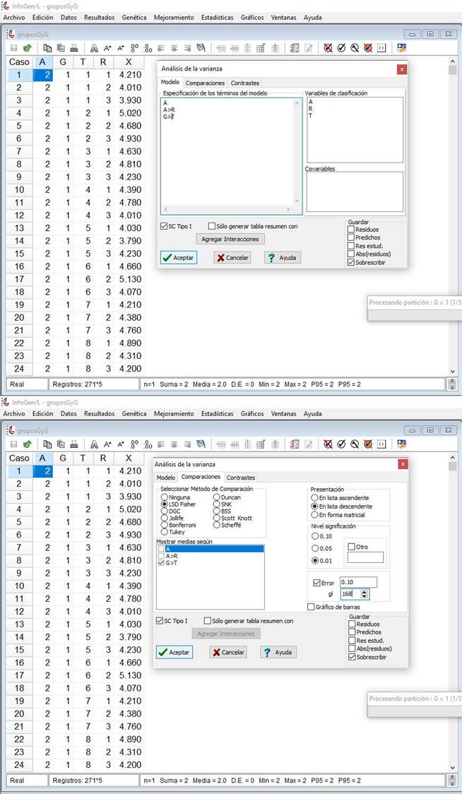 En el presente estudio, las componentes de la UP deberán probarse utilizando el error a, mientras que las correspondientes a la SUB, emplearán el error b. Para la comparación de medias de variedades dentro de grupos, InfoStat e InfoGen son muy flexibles, debido a que en ambos la base de datos se ordena automáticamente y adicionalmente, ambos permiten realizar la corrección que debe efectuarse a la diferencia mínima significativa honesta o prueba de Tukey, pero deben capturarse manualmente los grados de libertad y el cuadrado medio del error b, generados con todos los datos registrados en la serie de experimentos; los correspondientes a cada ensayo también serán utilizados para realizar este tipo de pruebas de manera independiente.