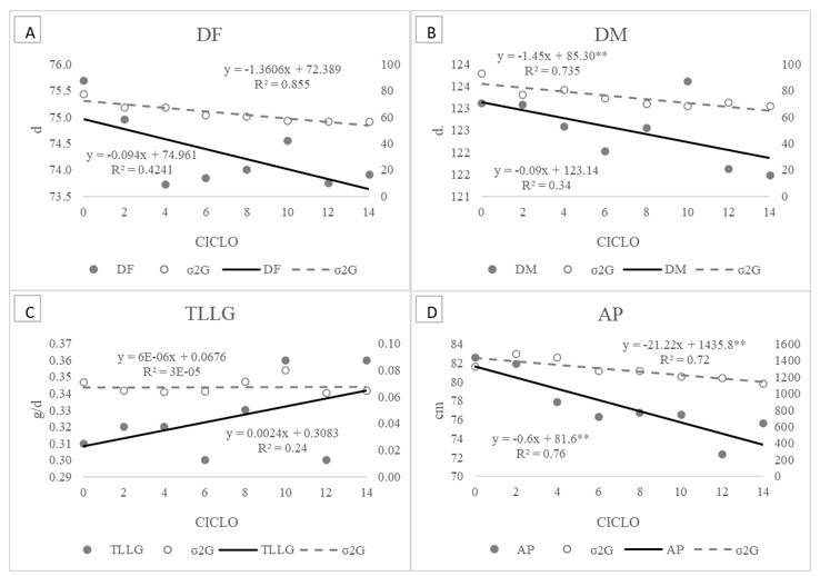 En 2014, Villaseñor-Mir et al. (2014) reportaron la generación del gene androestéril dominante Oly, el cual permitió la formación de la población PANDOLY. La selección de plantas individuales con características deseables y con el control del progenitor femenino permitió que la respuesta por ciclo en la población PANDOLY.PABG para DF, DM y AP presentara una relación lineal negativa significativa, lo que se reflejó en la disminución de 1.32 días a antesis, 1.26 días a la madurez fisiológica y 8.45 cm de altura después de 14 ciclos de selección (Figura 1A, 1B y 1D), Olmedo-Arcega et al. (1995) también reportan disminución por ciclo de -0.22 (bi) para días a floración al evaluar tres ciclos de selección recurrente.