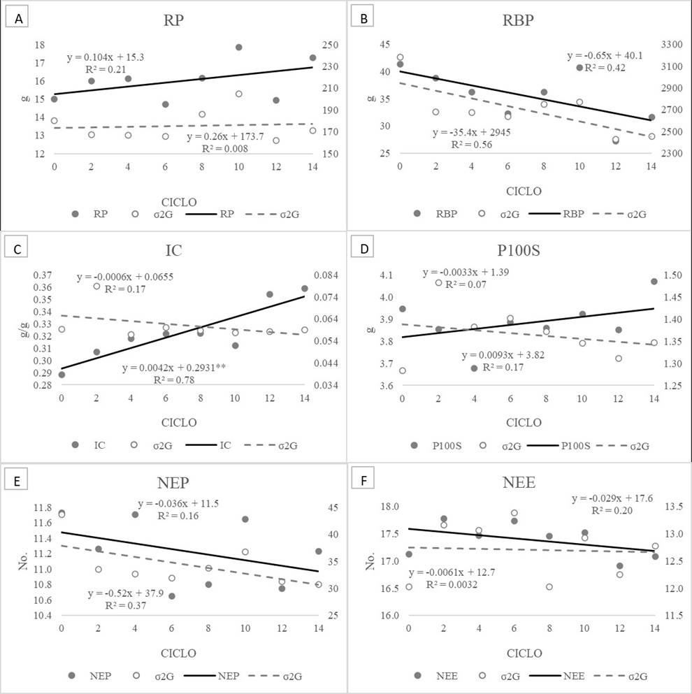 Se espera que el valor mayor de σ2A se encuentre en C0 porque es el ciclo inicial donde se recombinó el total de progenitores, pero no fue así para AP (C2), RGP (C10), IC (C2), P100S (C2) y NEE (C6); lo mismo sucede con la σ2D (Cuadro 4), ya que es de esperar que las poblaciones sometidas a un proceso de mejoramiento disminuyan su variabilidad. La σ2A en C2 aumentó en NEE, AP, P100S e IC de 5.9, 6.7, 8.8, y 17.8%, respectivamente, y en ciclos posteriores comenzó a disminuir, con excepción de NEE que aumentó y disminuyó a lo largo de los ciclos.